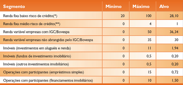 É bom destacar que os 30% destinados para a renda variável são resultantes de análise de risco e retorno, estudos de otimização de carteiras, além de atender a uma demanda dos associados conforme pesquisa realizada com os participantes, há dois anos, onde 80% se mostravam dispostos a investir em renda variável. No cenário econômico atual, em que se prevê maior redução das taxas de juros e estabilização dos resultados das empresas, a opção por essa relação de investimento mostrou-se a mais adequada. É bom lembrar, entretanto, que se tratam de políticas reavaliadas anualmente.
