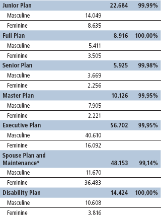 *In Plan Spouse, for 4,558 participants, the age of the wife insured as principal component plus three years was considered as being the age of the masculine spouse; in the case of wives it was considered the age of the husband insured as principal component less three years.