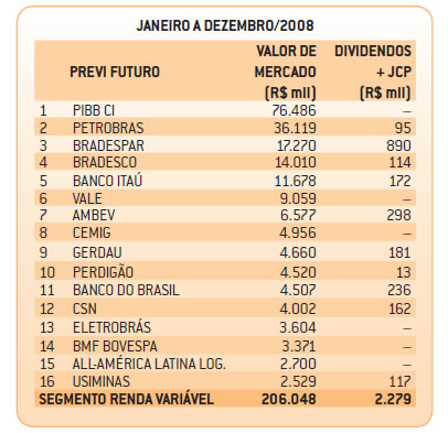 A rentabilidade do segmento de Renda Variável fechou 2008 com desempenho negativo, de -41,68%, um desempenho que é melhor se comparado ao da própria Bolsa de Valores, cujo índice IBrX-50 acumulou perdas de -43,14%. Esse desempenho um pouco superior à média do mercado deveu-se em parte à estratégia de compras e vendas desenvolvida sobretudo no período de maior volatilidade da Bolsa.