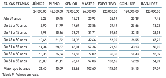 A Tabela P mostra as contribuições mensais vigentes a partir de 1/5/2009, correspondentes às importâncias seguradas da Capec, considerando a taxa de administração de 2,5% e a taxa de contingência de 10%: