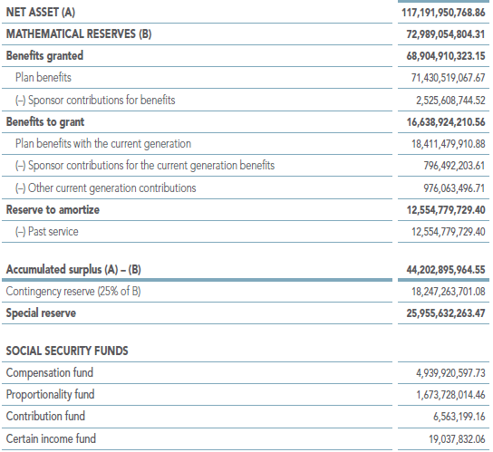 As a result of the performance of the investment assets and the normal evolution of the social security liability, an accumulated technical surplus of R$ 44,202,895,964.55 was calculated, constituting a Contingency Reserve equivalent to R$ 18,247,263,701.08 and a Special Reserve for Plan Revision of R$ 25,955,632,263.47.